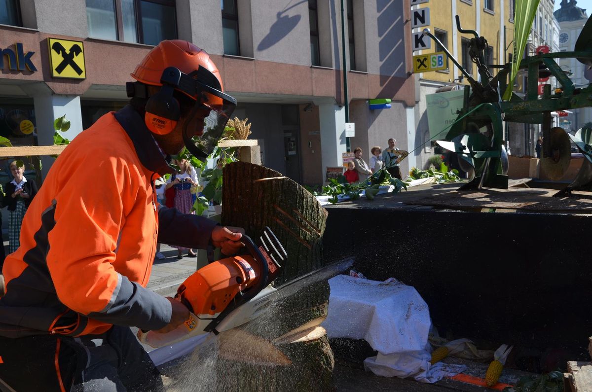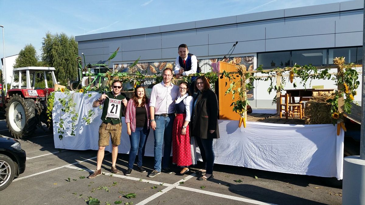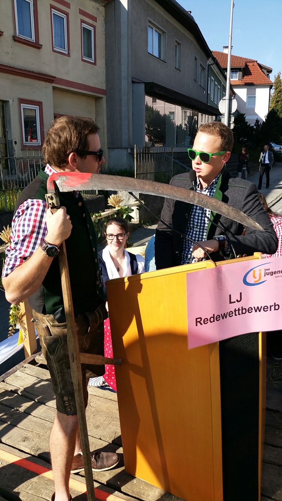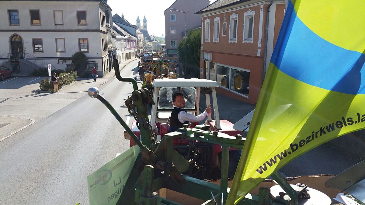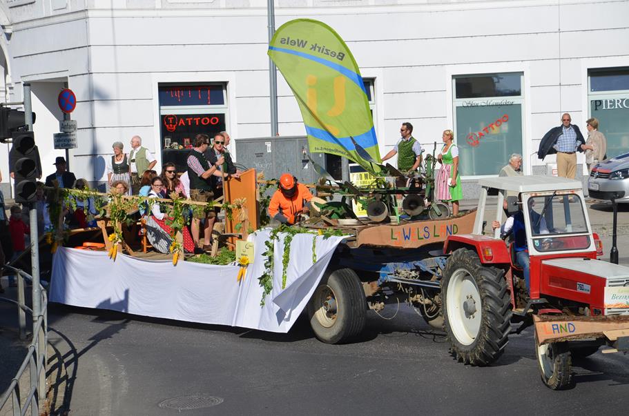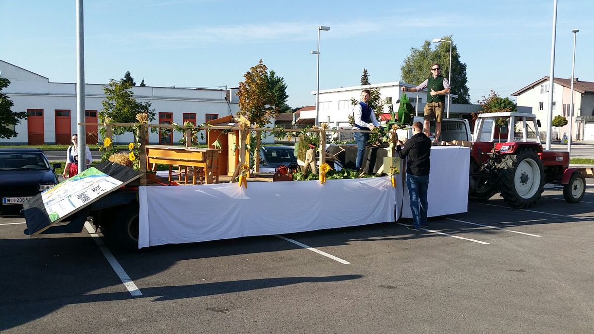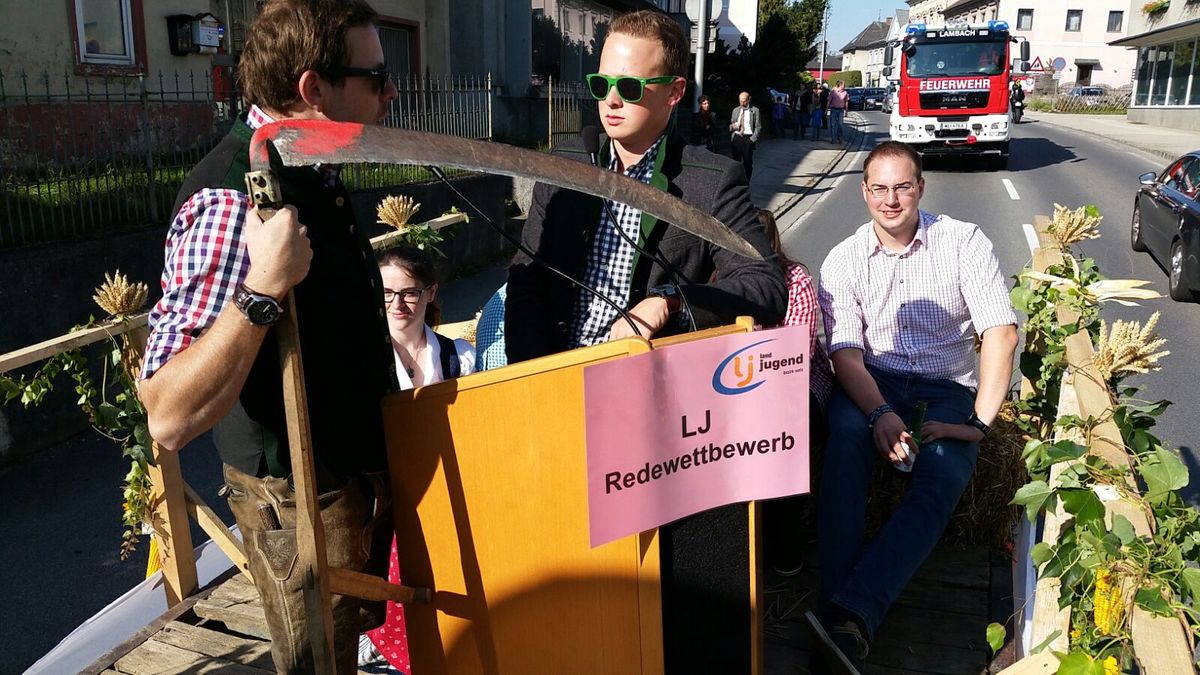 Tausende Besucher erleben eine "Leistungsschau" der Welser Landwirtschaft am 13. September. Erstmals fand das Bezirkserntedankfest der Bauernschaft in Lambach statt. Dreißig aufwändig geschmückte Festwägen, begleitet von zahlreichen Musikgruppe, zogen von Lambach über die Traun in das Hengstendepot Stadl Paura (Pferdezentrum Lambach). Natürlich durften wir bei diesem Spektakel nicht fehlen. Doch was sollten wir als Landjugend darstellen, für das wir dankbar sind? Die einzelnen Ortsbauernschaften schmückten ihre Wägen mit Dingen, die typisch für ihren Ort sind. Sipbachzell hat seine Krapfen, Buchkirchen das Obst, aber wir? Schlussendlich hatte wieder einmal unser Hauns die Idee. Wir sagen danke, für die zahlreiche Teilnahme unserer Mitglieder bei den diversen Bewerben. So stellten wir die Bewerbe rund um das Landjugendjahr dar. Angefangen mit dem Mähen, den Wissensbewerben wie Agrar- und Genuss, Reden, Forst bis hin zum Pflügen. Nach dem Umzugin die Reithalle und des Festgottesdienstes durch Abt Maximilian Neulinger ließen wir den ereignisreichen Tag bei einem Rundgang in der Genussstraße ausklingen.