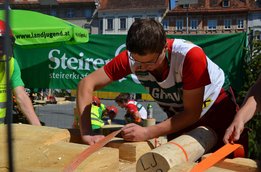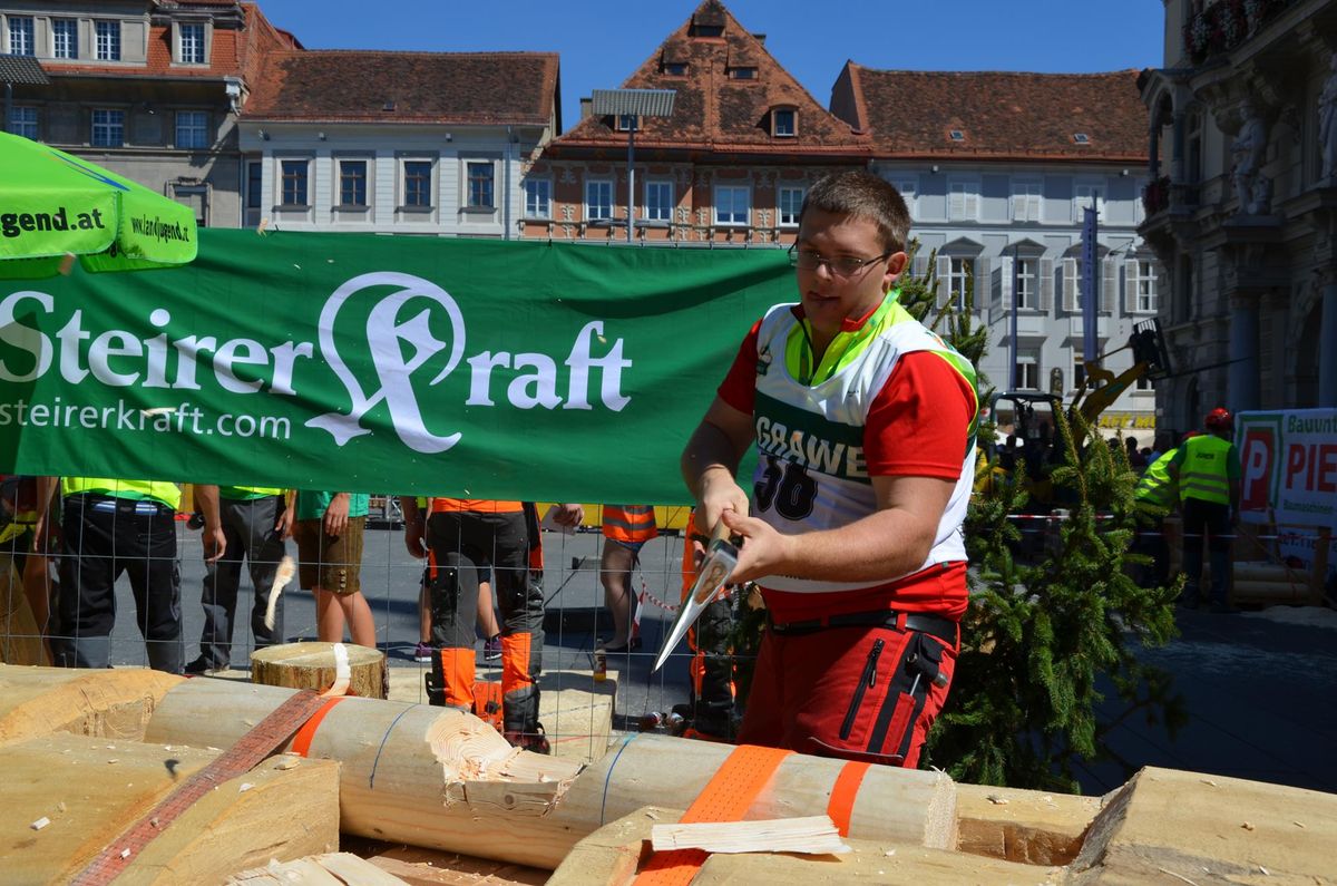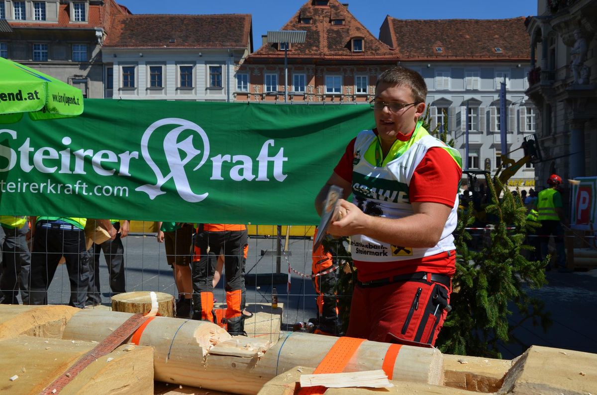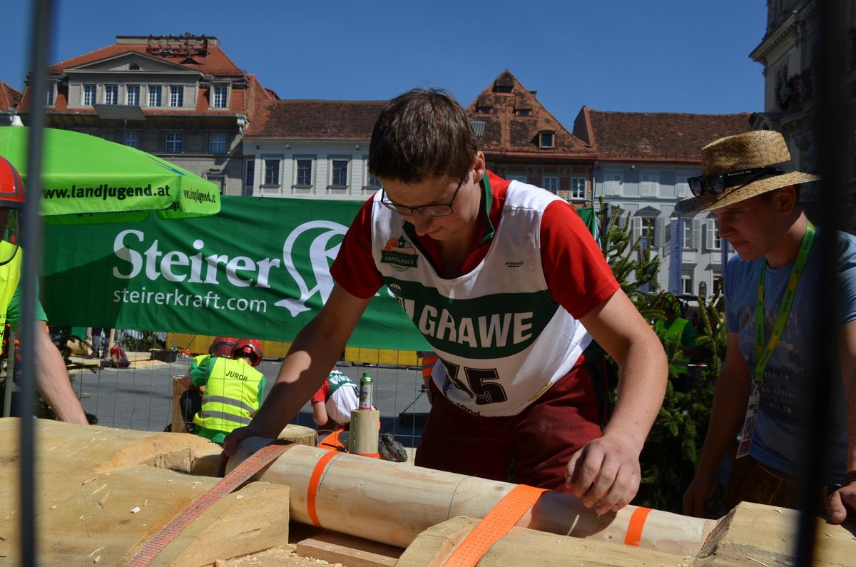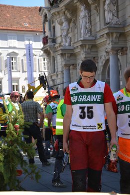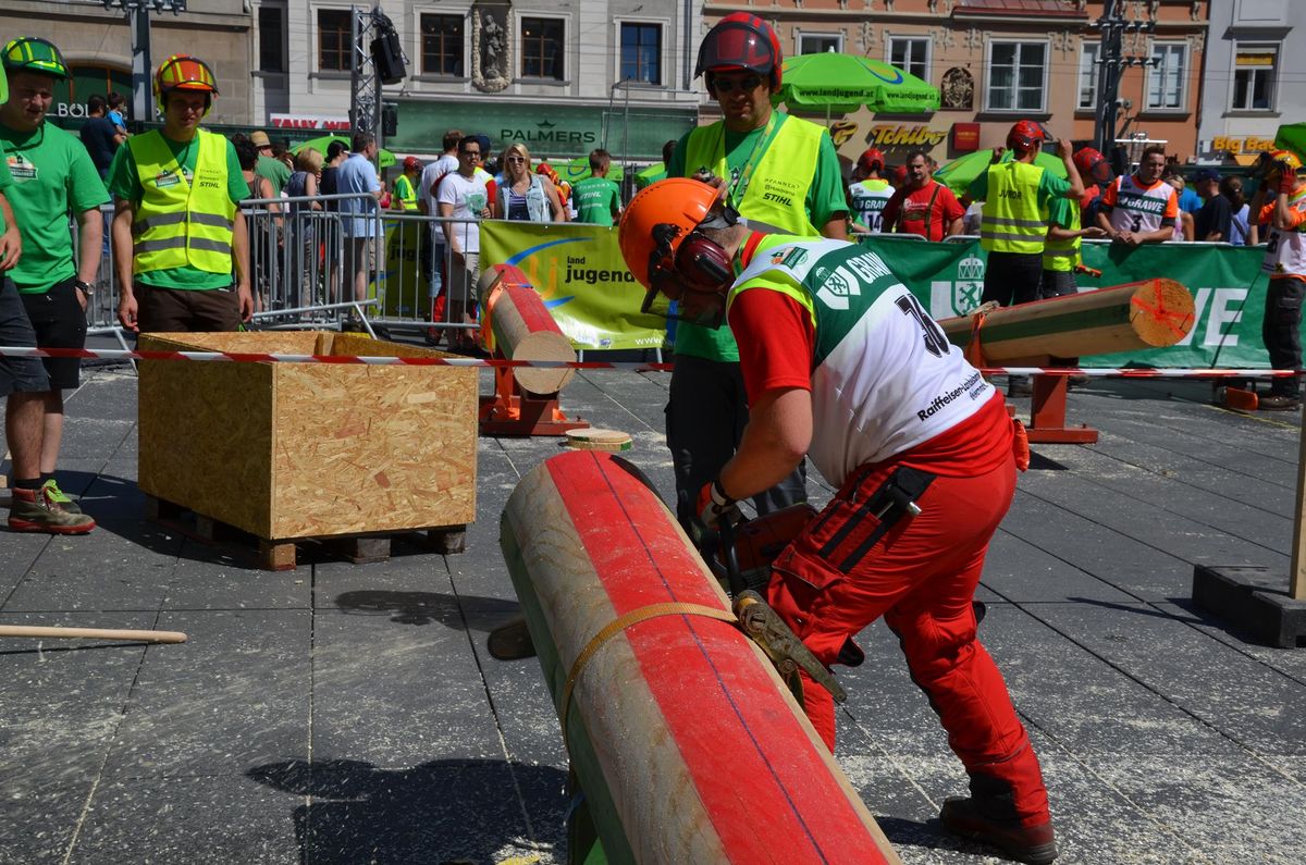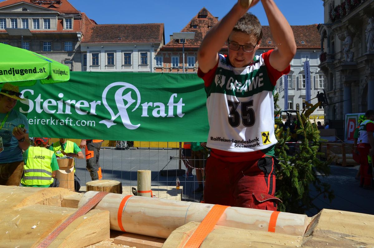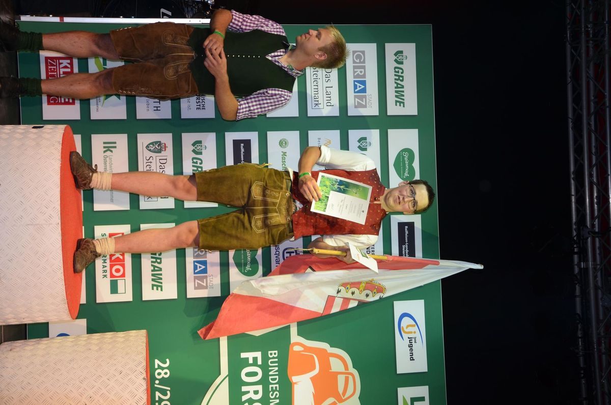 Nach Innsbruck (2011) und Deutsch-Griffen (2013) durfte ich auch heuer wieder Oberösterreich beim Bundesentscheid der Forstarbeit am Grazer Hauptplatz vertreten. Zur Routine werden die Wettkämpfe, sei es auf Bezirks-, Landes- und Bundesebeneaber nie. Für die Forstarbeit braucht man nicht nur Kraft und Ausdauer. Schnell und sauber arbeiteten darauf kommt es an. Ist am Bewerbstag noch das berühmte Quäntchen Glück dabei, dann ist man bestens für den Bundesentscheid gerüstet. Natürlich geht ohne hartem Training nichts, um mit den Teilnehmern aus Kärnten, Tirol oder der Steiermark mithalten zu können. Die meisten Starter aus diesen Bundesländern besuchen Schulen wie die LFS Litzlhof, in denen sie auf derartige Wettkämpfe bestens vorbereitet werden. Heuer kam ich nur drei Wochen zuvor zum Trainieren. Dazu kam die drückende Hitze am Hauptplatz, wodurch alles noch anstrengender wurde. Deshalb bin ich besonders stolz auf meine erzielten Leistungen. Der erste Platz in der Disziplin Kombinationsschnitt und der zweite im Durchhacken sind ein krönender Abschluss der diesjährigen Bewerbssaison. Das Gefühl einmal ganz oben zu stehen und zu wissen, dass man im Verhältnis zum anderen weniger dafür gemacht hat, wird mir noch lange in Gedanken bleiben. Aber auch der Jubel des eigens angereisten Fanclubs und der "Konkurrenz" aus dem eigenen Bundesland machten den kurzen Moment unvergesslich. In zwei Jahren finden die nächsten Meisterschaften statt. Da möchte ich noch ein letztes Mal mitmachen und fehlerfrei alle Stationen meistern, um einmal ganz vorne zu sein. Ein Bericht von Peter Strassmair, LJ Thalheim. Er erreichte in der Gesamtwertung den 17. Platz. Nicht zu vergessen ist Georg Strauss aus Neukirchen. Georg durfte als vierter Oberösterreicher beim Bundesentscheid antreten. Als Newcomer darf er besonders stolz auf seine Leistung sein. Er erreichte den 22. Platz in der Landjugendwertung. -> Ergebnisliste Einzelwertung -> Ergebnisliste Disziplinenwertung -> Ergebnisliste Gruppenwertung -> Fotos LJ OÖ -> Fotos Theoriebewerb -> Fotos Bewerb -> Fotos Finale -> Fotos Siegerehrung