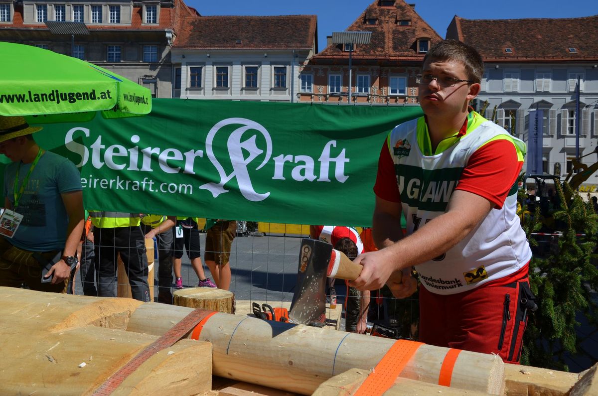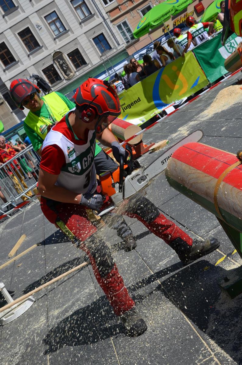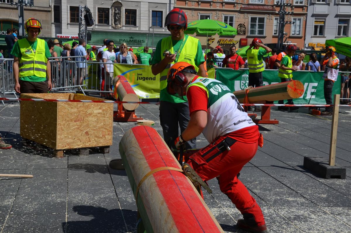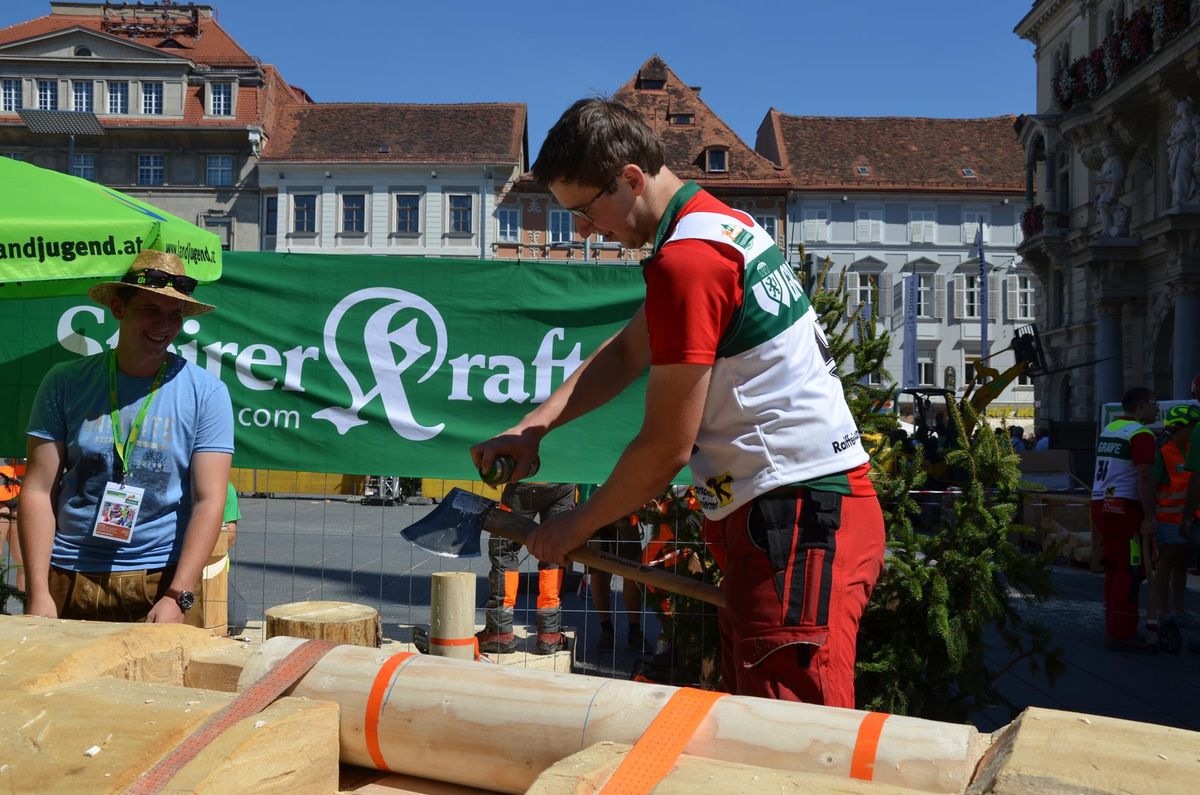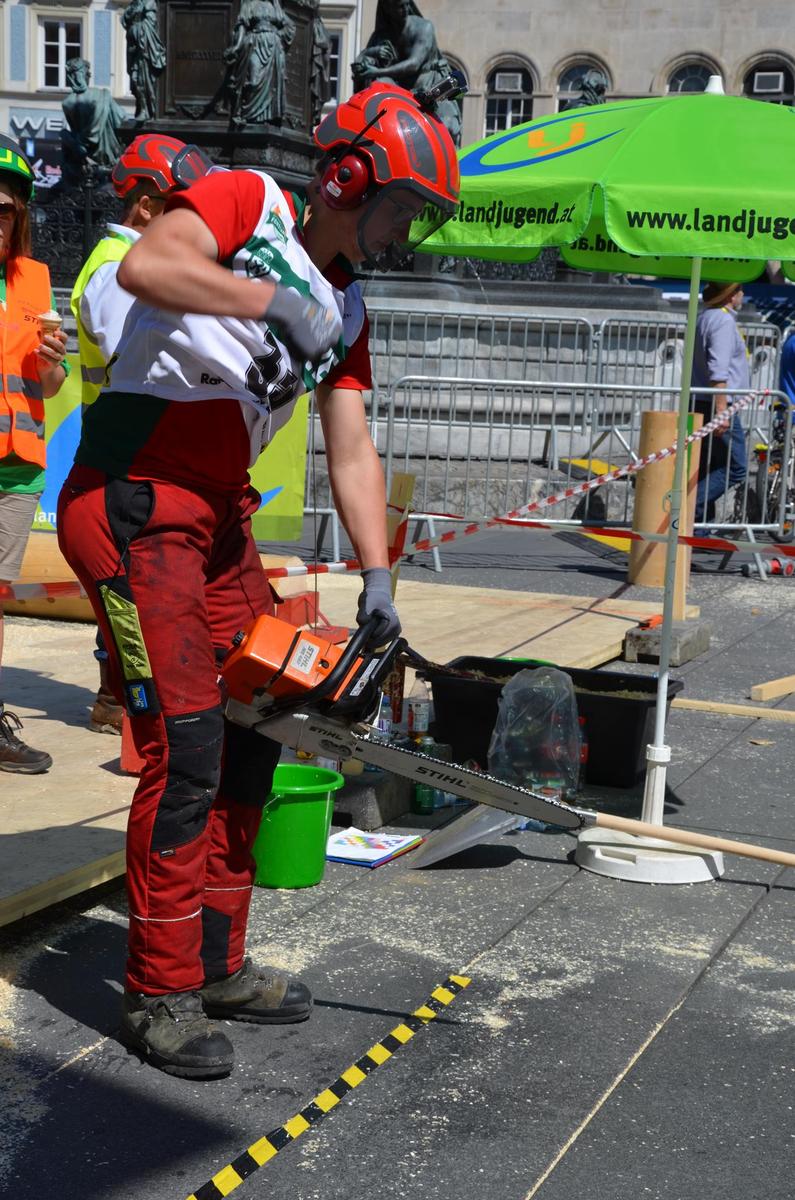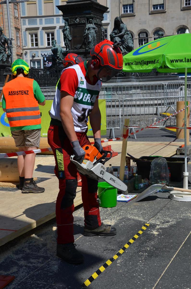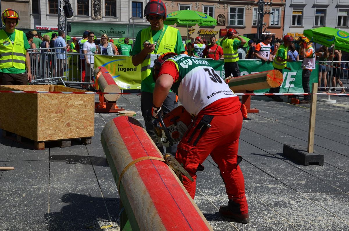 Nach Innsbruck (2011) und Deutsch-Griffen (2013) durfte ich auch heuer wieder Oberösterreich beim Bundesentscheid der Forstarbeit am Grazer Hauptplatz vertreten. Zur Routine werden die Wettkämpfe, sei es auf Bezirks-, Landes- und Bundesebeneaber nie. Für die Forstarbeit braucht man nicht nur Kraft und Ausdauer. Schnell und sauber arbeiteten darauf kommt es an. Ist am Bewerbstag noch das berühmte Quäntchen Glück dabei, dann ist man bestens für den Bundesentscheid gerüstet. Natürlich geht ohne hartem Training nichts, um mit den Teilnehmern aus Kärnten, Tirol oder der Steiermark mithalten zu können. Die meisten Starter aus diesen Bundesländern besuchen Schulen wie die LFS Litzlhof, in denen sie auf derartige Wettkämpfe bestens vorbereitet werden. Heuer kam ich nur drei Wochen zuvor zum Trainieren. Dazu kam die drückende Hitze am Hauptplatz, wodurch alles noch anstrengender wurde. Deshalb bin ich besonders stolz auf meine erzielten Leistungen. Der erste Platz in der Disziplin Kombinationsschnitt und der zweite im Durchhacken sind ein krönender Abschluss der diesjährigen Bewerbssaison. Das Gefühl einmal ganz oben zu stehen und zu wissen, dass man im Verhältnis zum anderen weniger dafür gemacht hat, wird mir noch lange in Gedanken bleiben. Aber auch der Jubel des eigens angereisten Fanclubs und der "Konkurrenz" aus dem eigenen Bundesland machten den kurzen Moment unvergesslich. In zwei Jahren finden die nächsten Meisterschaften statt. Da möchte ich noch ein letztes Mal mitmachen und fehlerfrei alle Stationen meistern, um einmal ganz vorne zu sein. Ein Bericht von Peter Strassmair, LJ Thalheim. Er erreichte in der Gesamtwertung den 17. Platz. Nicht zu vergessen ist Georg Strauss aus Neukirchen. Georg durfte als vierter Oberösterreicher beim Bundesentscheid antreten. Als Newcomer darf er besonders stolz auf seine Leistung sein. Er erreichte den 22. Platz in der Landjugendwertung. -> Ergebnisliste Einzelwertung -> Ergebnisliste Disziplinenwertung -> Ergebnisliste Gruppenwertung -> Fotos LJ OÖ -> Fotos Theoriebewerb -> Fotos Bewerb -> Fotos Finale -> Fotos Siegerehrung