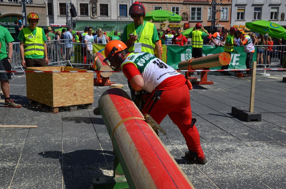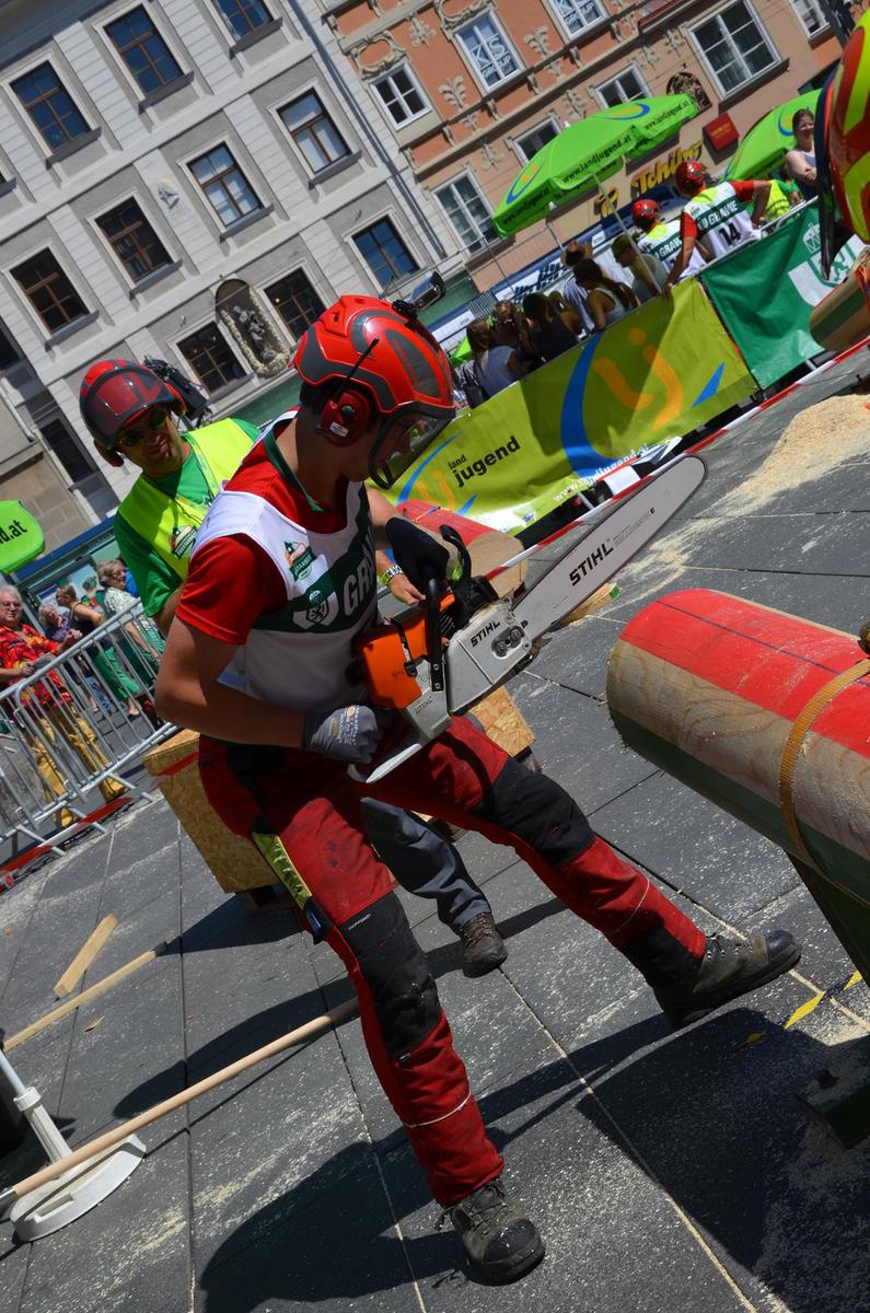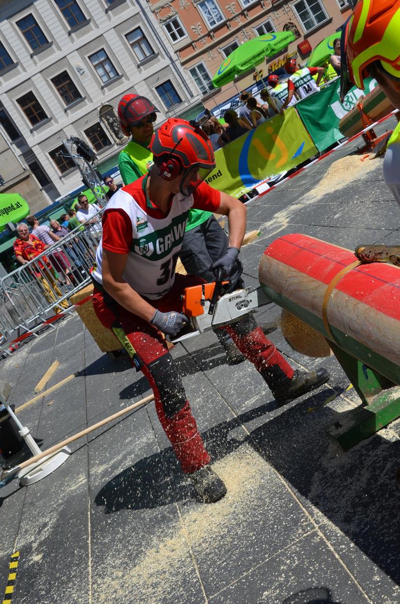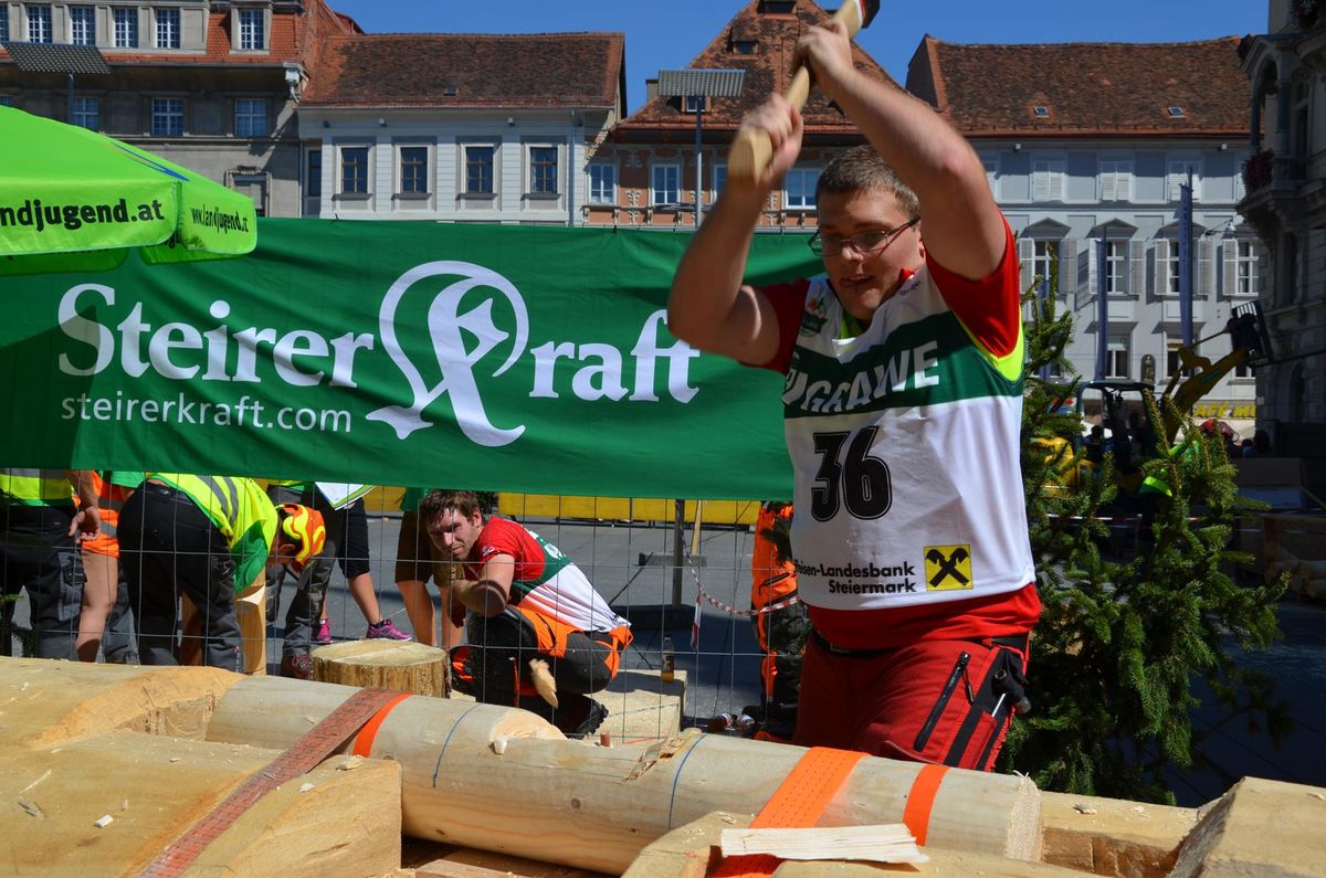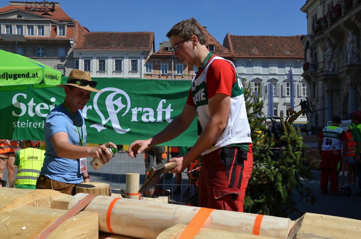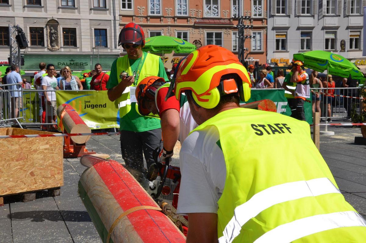 Nach Innsbruck (2011) und Deutsch-Griffen (2013) durfte ich auch heuer wieder Oberösterreich beim Bundesentscheid der Forstarbeit am Grazer Hauptplatz vertreten. Zur Routine werden die Wettkämpfe, sei es auf Bezirks-, Landes- und Bundesebeneaber nie. Für die Forstarbeit braucht man nicht nur Kraft und Ausdauer. Schnell und sauber arbeiteten darauf kommt es an. Ist am Bewerbstag noch das berühmte Quäntchen Glück dabei, dann ist man bestens für den Bundesentscheid gerüstet. Natürlich geht ohne hartem Training nichts, um mit den Teilnehmern aus Kärnten, Tirol oder der Steiermark mithalten zu können. Die meisten Starter aus diesen Bundesländern besuchen Schulen wie die LFS Litzlhof, in denen sie auf derartige Wettkämpfe bestens vorbereitet werden. Heuer kam ich nur drei Wochen zuvor zum Trainieren. Dazu kam die drückende Hitze am Hauptplatz, wodurch alles noch anstrengender wurde. Deshalb bin ich besonders stolz auf meine erzielten Leistungen. Der erste Platz in der Disziplin Kombinationsschnitt und der zweite im Durchhacken sind ein krönender Abschluss der diesjährigen Bewerbssaison. Das Gefühl einmal ganz oben zu stehen und zu wissen, dass man im Verhältnis zum anderen weniger dafür gemacht hat, wird mir noch lange in Gedanken bleiben. Aber auch der Jubel des eigens angereisten Fanclubs und der "Konkurrenz" aus dem eigenen Bundesland machten den kurzen Moment unvergesslich. In zwei Jahren finden die nächsten Meisterschaften statt. Da möchte ich noch ein letztes Mal mitmachen und fehlerfrei alle Stationen meistern, um einmal ganz vorne zu sein. Ein Bericht von Peter Strassmair, LJ Thalheim. Er erreichte in der Gesamtwertung den 17. Platz. Nicht zu vergessen ist Georg Strauss aus Neukirchen. Georg durfte als vierter Oberösterreicher beim Bundesentscheid antreten. Als Newcomer darf er besonders stolz auf seine Leistung sein. Er erreichte den 22. Platz in der Landjugendwertung. -> Ergebnisliste Einzelwertung -> Ergebnisliste Disziplinenwertung -> Ergebnisliste Gruppenwertung -> Fotos LJ OÖ -> Fotos Theoriebewerb -> Fotos Bewerb -> Fotos Finale -> Fotos Siegerehrung