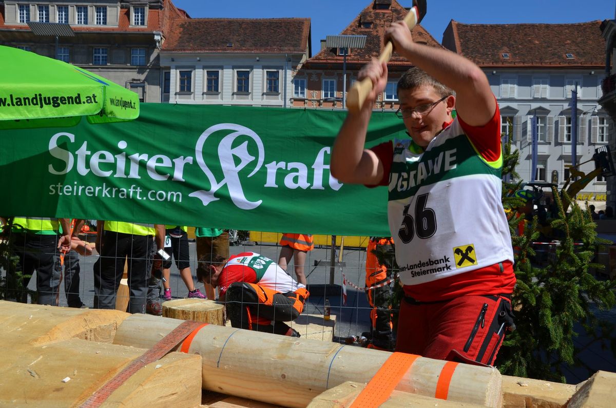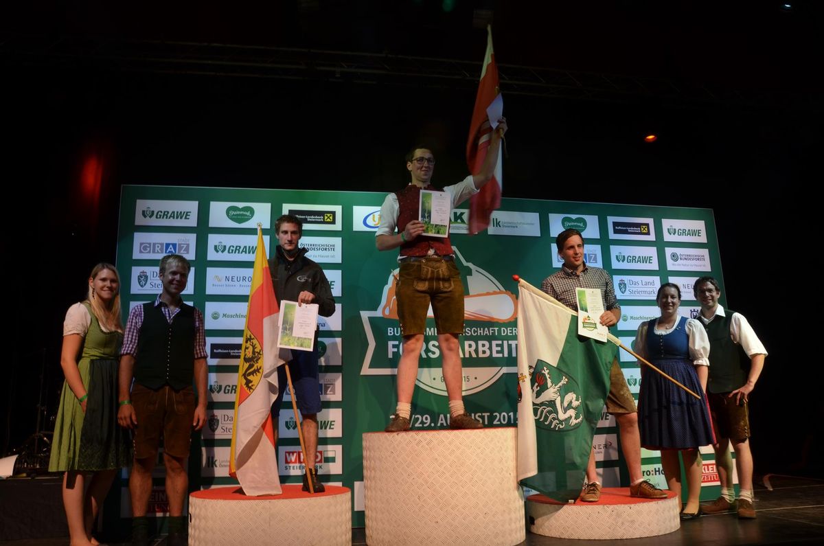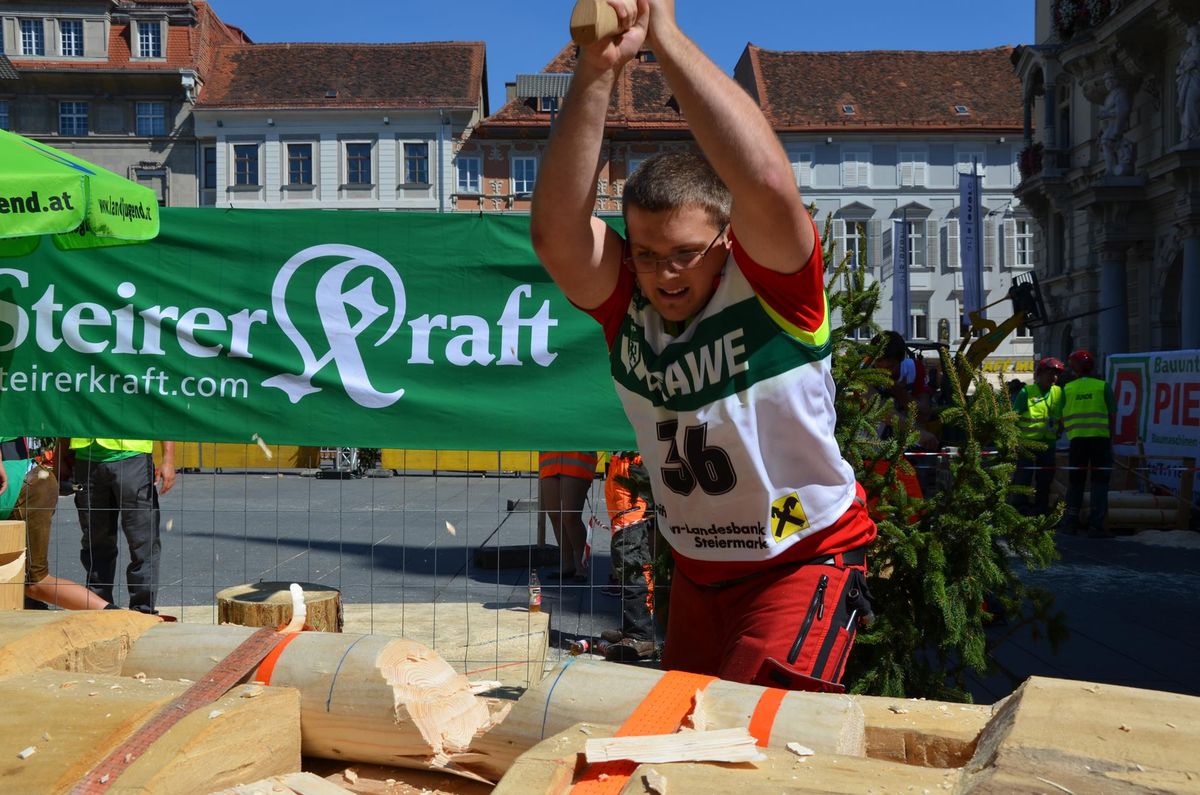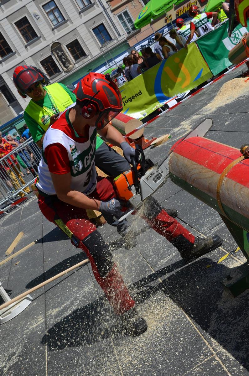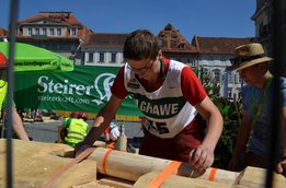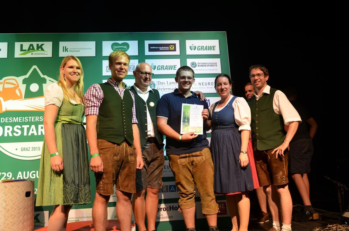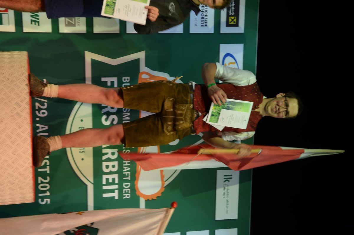 Nach Innsbruck (2011) und Deutsch-Griffen (2013) durfte ich auch heuer wieder Oberösterreich beim Bundesentscheid der Forstarbeit am Grazer Hauptplatz vertreten. Zur Routine werden die Wettkämpfe, sei es auf Bezirks-, Landes- und Bundesebeneaber nie. Für die Forstarbeit braucht man nicht nur Kraft und Ausdauer. Schnell und sauber arbeiteten darauf kommt es an. Ist am Bewerbstag noch das berühmte Quäntchen Glück dabei, dann ist man bestens für den Bundesentscheid gerüstet. Natürlich geht ohne hartem Training nichts, um mit den Teilnehmern aus Kärnten, Tirol oder der Steiermark mithalten zu können. Die meisten Starter aus diesen Bundesländern besuchen Schulen wie die LFS Litzlhof, in denen sie auf derartige Wettkämpfe bestens vorbereitet werden. Heuer kam ich nur drei Wochen zuvor zum Trainieren. Dazu kam die drückende Hitze am Hauptplatz, wodurch alles noch anstrengender wurde. Deshalb bin ich besonders stolz auf meine erzielten Leistungen. Der erste Platz in der Disziplin Kombinationsschnitt und der zweite im Durchhacken sind ein krönender Abschluss der diesjährigen Bewerbssaison. Das Gefühl einmal ganz oben zu stehen und zu wissen, dass man im Verhältnis zum anderen weniger dafür gemacht hat, wird mir noch lange in Gedanken bleiben. Aber auch der Jubel des eigens angereisten Fanclubs und der "Konkurrenz" aus dem eigenen Bundesland machten den kurzen Moment unvergesslich. In zwei Jahren finden die nächsten Meisterschaften statt. Da möchte ich noch ein letztes Mal mitmachen und fehlerfrei alle Stationen meistern, um einmal ganz vorne zu sein. Ein Bericht von Peter Strassmair, LJ Thalheim. Er erreichte in der Gesamtwertung den 17. Platz. Nicht zu vergessen ist Georg Strauss aus Neukirchen. Georg durfte als vierter Oberösterreicher beim Bundesentscheid antreten. Als Newcomer darf er besonders stolz auf seine Leistung sein. Er erreichte den 22. Platz in der Landjugendwertung. -> Ergebnisliste Einzelwertung -> Ergebnisliste Disziplinenwertung -> Ergebnisliste Gruppenwertung -> Fotos LJ OÖ -> Fotos Theoriebewerb -> Fotos Bewerb -> Fotos Finale -> Fotos Siegerehrung