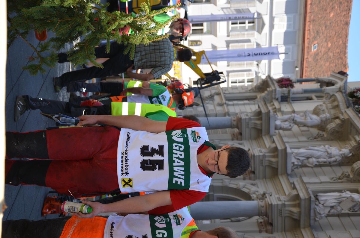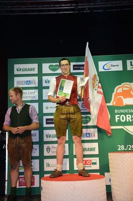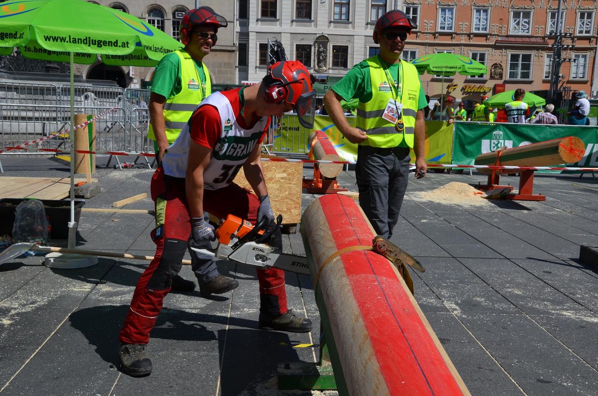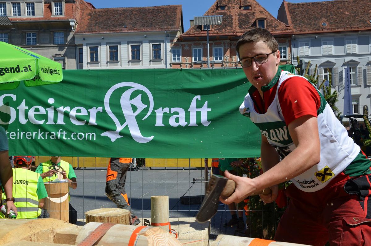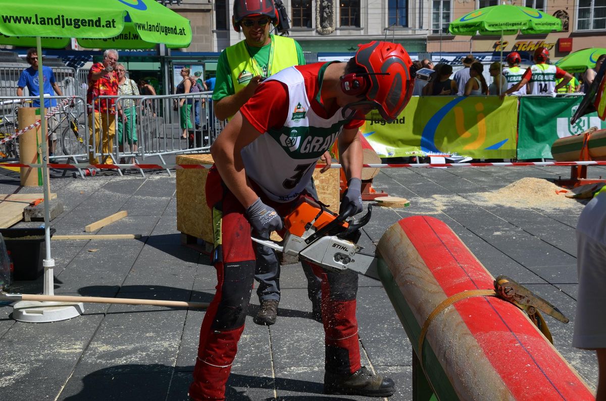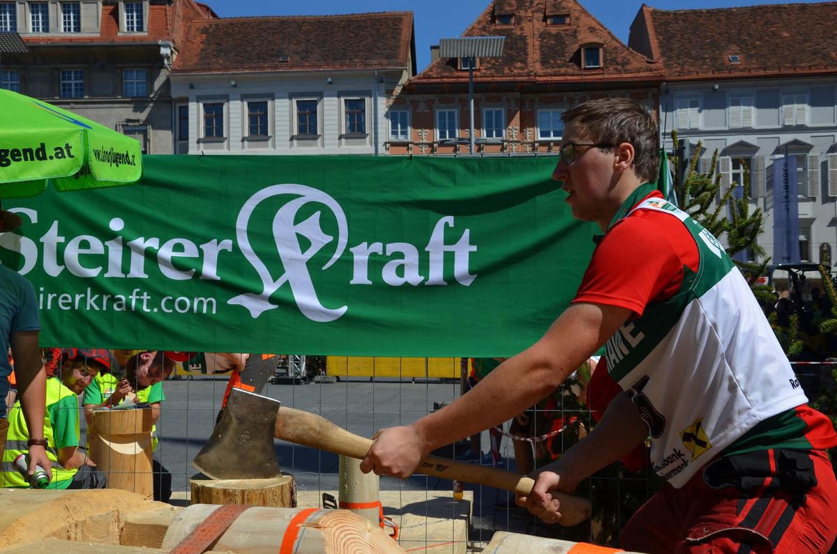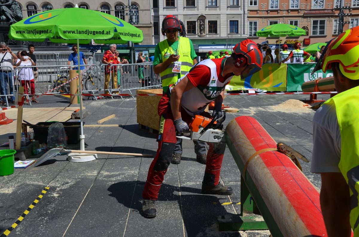 Nach Innsbruck (2011) und Deutsch-Griffen (2013) durfte ich auch heuer wieder Oberösterreich beim Bundesentscheid der Forstarbeit am Grazer Hauptplatz vertreten. Zur Routine werden die Wettkämpfe, sei es auf Bezirks-, Landes- und Bundesebeneaber nie. Für die Forstarbeit braucht man nicht nur Kraft und Ausdauer. Schnell und sauber arbeiteten darauf kommt es an. Ist am Bewerbstag noch das berühmte Quäntchen Glück dabei, dann ist man bestens für den Bundesentscheid gerüstet. Natürlich geht ohne hartem Training nichts, um mit den Teilnehmern aus Kärnten, Tirol oder der Steiermark mithalten zu können. Die meisten Starter aus diesen Bundesländern besuchen Schulen wie die LFS Litzlhof, in denen sie auf derartige Wettkämpfe bestens vorbereitet werden. Heuer kam ich nur drei Wochen zuvor zum Trainieren. Dazu kam die drückende Hitze am Hauptplatz, wodurch alles noch anstrengender wurde. Deshalb bin ich besonders stolz auf meine erzielten Leistungen. Der erste Platz in der Disziplin Kombinationsschnitt und der zweite im Durchhacken sind ein krönender Abschluss der diesjährigen Bewerbssaison. Das Gefühl einmal ganz oben zu stehen und zu wissen, dass man im Verhältnis zum anderen weniger dafür gemacht hat, wird mir noch lange in Gedanken bleiben. Aber auch der Jubel des eigens angereisten Fanclubs und der "Konkurrenz" aus dem eigenen Bundesland machten den kurzen Moment unvergesslich. In zwei Jahren finden die nächsten Meisterschaften statt. Da möchte ich noch ein letztes Mal mitmachen und fehlerfrei alle Stationen meistern, um einmal ganz vorne zu sein. Ein Bericht von Peter Strassmair, LJ Thalheim. Er erreichte in der Gesamtwertung den 17. Platz. Nicht zu vergessen ist Georg Strauss aus Neukirchen. Georg durfte als vierter Oberösterreicher beim Bundesentscheid antreten. Als Newcomer darf er besonders stolz auf seine Leistung sein. Er erreichte den 22. Platz in der Landjugendwertung. -> Ergebnisliste Einzelwertung -> Ergebnisliste Disziplinenwertung -> Ergebnisliste Gruppenwertung -> Fotos LJ OÖ -> Fotos Theoriebewerb -> Fotos Bewerb -> Fotos Finale -> Fotos Siegerehrung