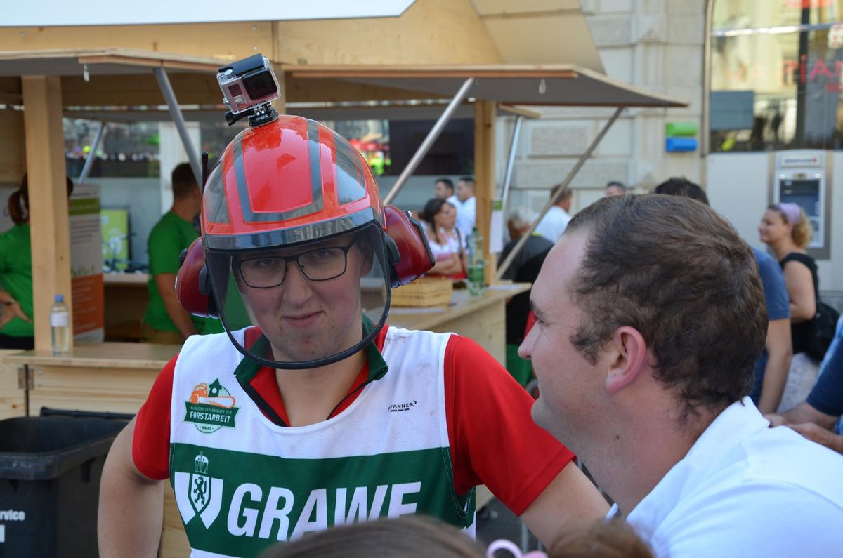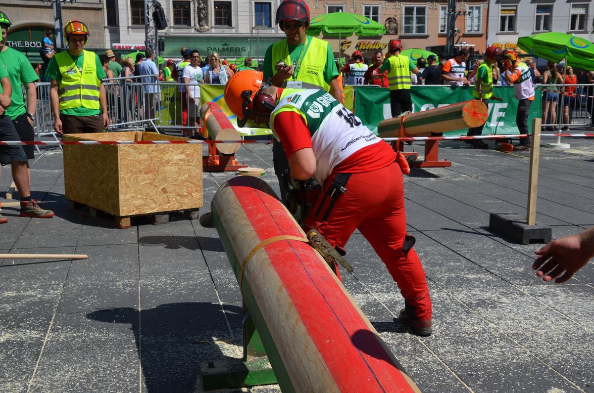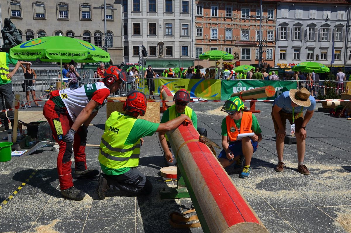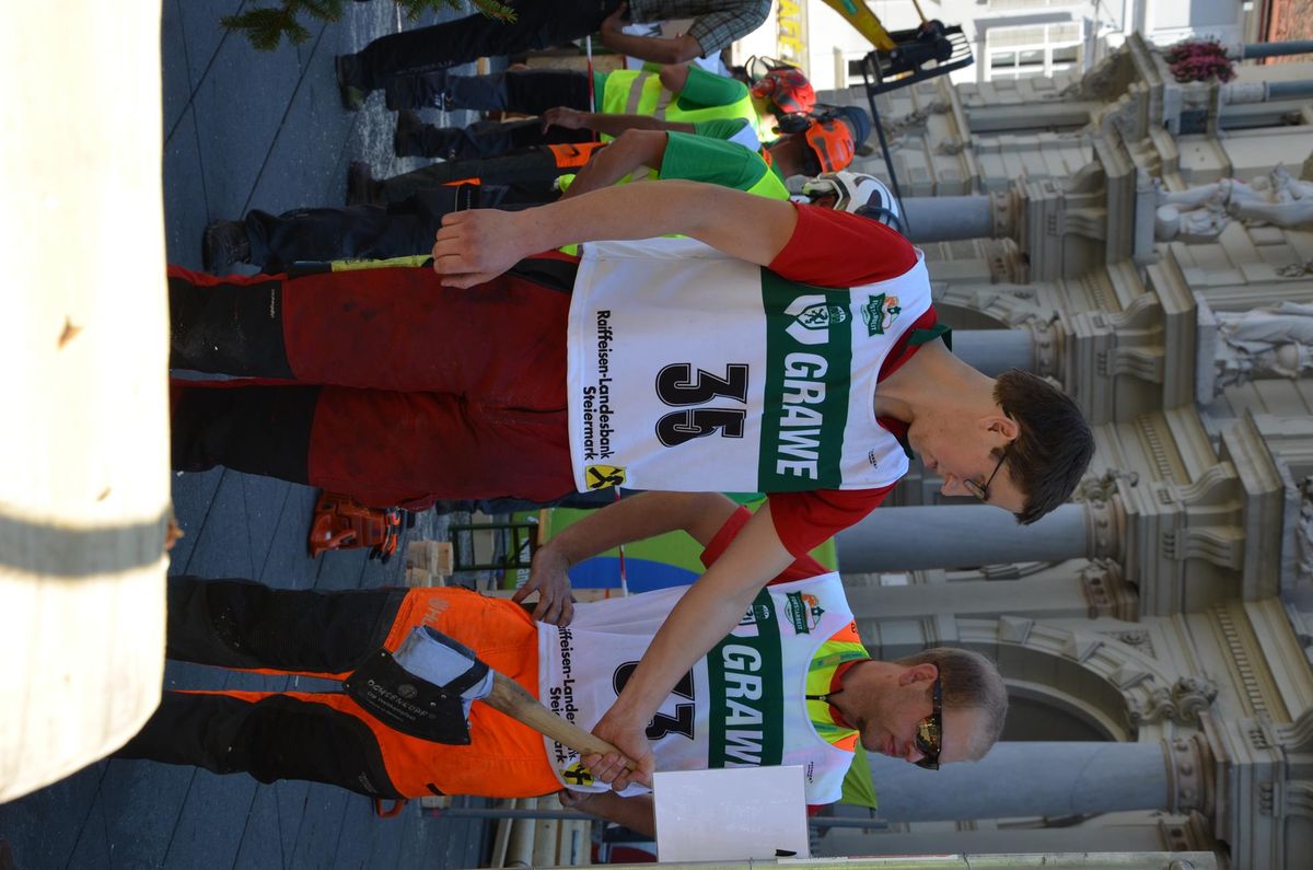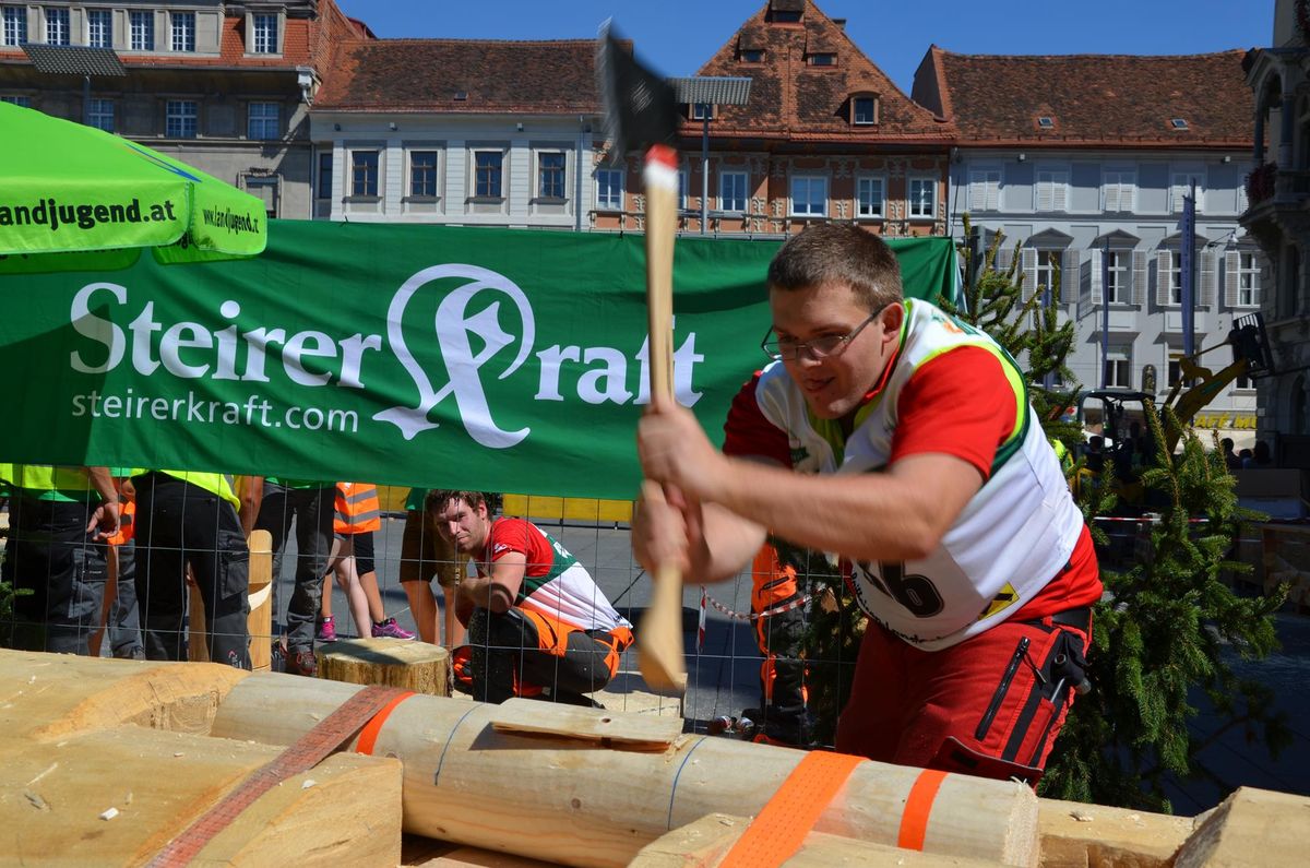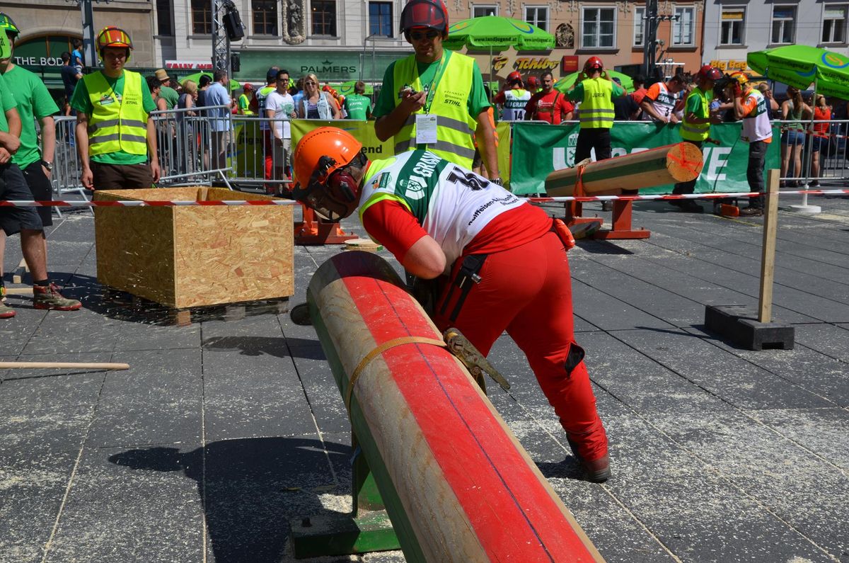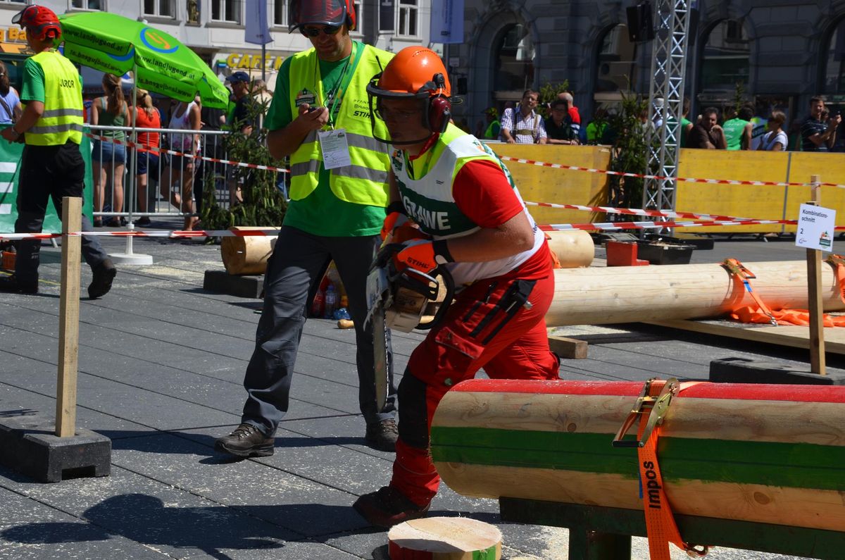 Nach Innsbruck (2011) und Deutsch-Griffen (2013) durfte ich auch heuer wieder Oberösterreich beim Bundesentscheid der Forstarbeit am Grazer Hauptplatz vertreten. Zur Routine werden die Wettkämpfe, sei es auf Bezirks-, Landes- und Bundesebeneaber nie. Für die Forstarbeit braucht man nicht nur Kraft und Ausdauer. Schnell und sauber arbeiteten darauf kommt es an. Ist am Bewerbstag noch das berühmte Quäntchen Glück dabei, dann ist man bestens für den Bundesentscheid gerüstet. Natürlich geht ohne hartem Training nichts, um mit den Teilnehmern aus Kärnten, Tirol oder der Steiermark mithalten zu können. Die meisten Starter aus diesen Bundesländern besuchen Schulen wie die LFS Litzlhof, in denen sie auf derartige Wettkämpfe bestens vorbereitet werden. Heuer kam ich nur drei Wochen zuvor zum Trainieren. Dazu kam die drückende Hitze am Hauptplatz, wodurch alles noch anstrengender wurde. Deshalb bin ich besonders stolz auf meine erzielten Leistungen. Der erste Platz in der Disziplin Kombinationsschnitt und der zweite im Durchhacken sind ein krönender Abschluss der diesjährigen Bewerbssaison. Das Gefühl einmal ganz oben zu stehen und zu wissen, dass man im Verhältnis zum anderen weniger dafür gemacht hat, wird mir noch lange in Gedanken bleiben. Aber auch der Jubel des eigens angereisten Fanclubs und der "Konkurrenz" aus dem eigenen Bundesland machten den kurzen Moment unvergesslich. In zwei Jahren finden die nächsten Meisterschaften statt. Da möchte ich noch ein letztes Mal mitmachen und fehlerfrei alle Stationen meistern, um einmal ganz vorne zu sein. Ein Bericht von Peter Strassmair, LJ Thalheim. Er erreichte in der Gesamtwertung den 17. Platz. Nicht zu vergessen ist Georg Strauss aus Neukirchen. Georg durfte als vierter Oberösterreicher beim Bundesentscheid antreten. Als Newcomer darf er besonders stolz auf seine Leistung sein. Er erreichte den 22. Platz in der Landjugendwertung. -> Ergebnisliste Einzelwertung -> Ergebnisliste Disziplinenwertung -> Ergebnisliste Gruppenwertung -> Fotos LJ OÖ -> Fotos Theoriebewerb -> Fotos Bewerb -> Fotos Finale -> Fotos Siegerehrung